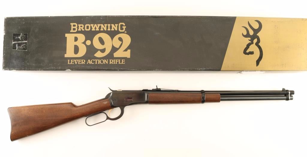· Browning B92 Lever Action Rifle in Original BoxThis lever action rifle was patterned after the Winchester Model 92 Blade front and buckhorn elevator rear sights on the barrel with the standard address and caliber markings and the full length magazine Blue receiver with polished locking blocks and smooth gold washed trigger Smooth straight grip stock withA very nice Browning Model 92 lever action rifle chambered for the44 Remington Magnum cartridge It has a " round barrel with a perfect bore This carbine was produced by Mirokou of Japan for Browning between 1978 and 1986, this rifle was made in 1930 percent for 357 Magnum Find Gun Values Grading System Login « Back BROWNING ARMS CO > B92 Carbine B92 Carbine Lever